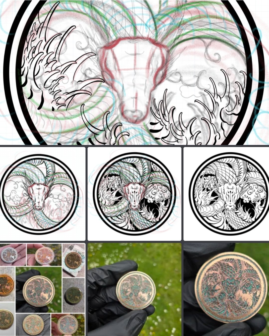 Heaven and Earth Serpent was inspired by K’s love and admiration for Japanese-style art. The process began as a sketch in Concepts, laser-engraved as a creative exercise and post-processed with a patina finish on solid brass.