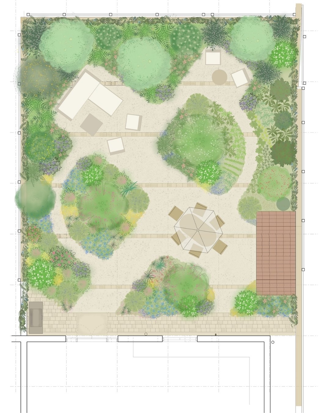 Ruth created this fabulous organic flowing garden design for a client located in Brixton. The site is a south-facing garden and features naturalistic island beds, curved paths and multiple seating nooks to fully soak in the space.
