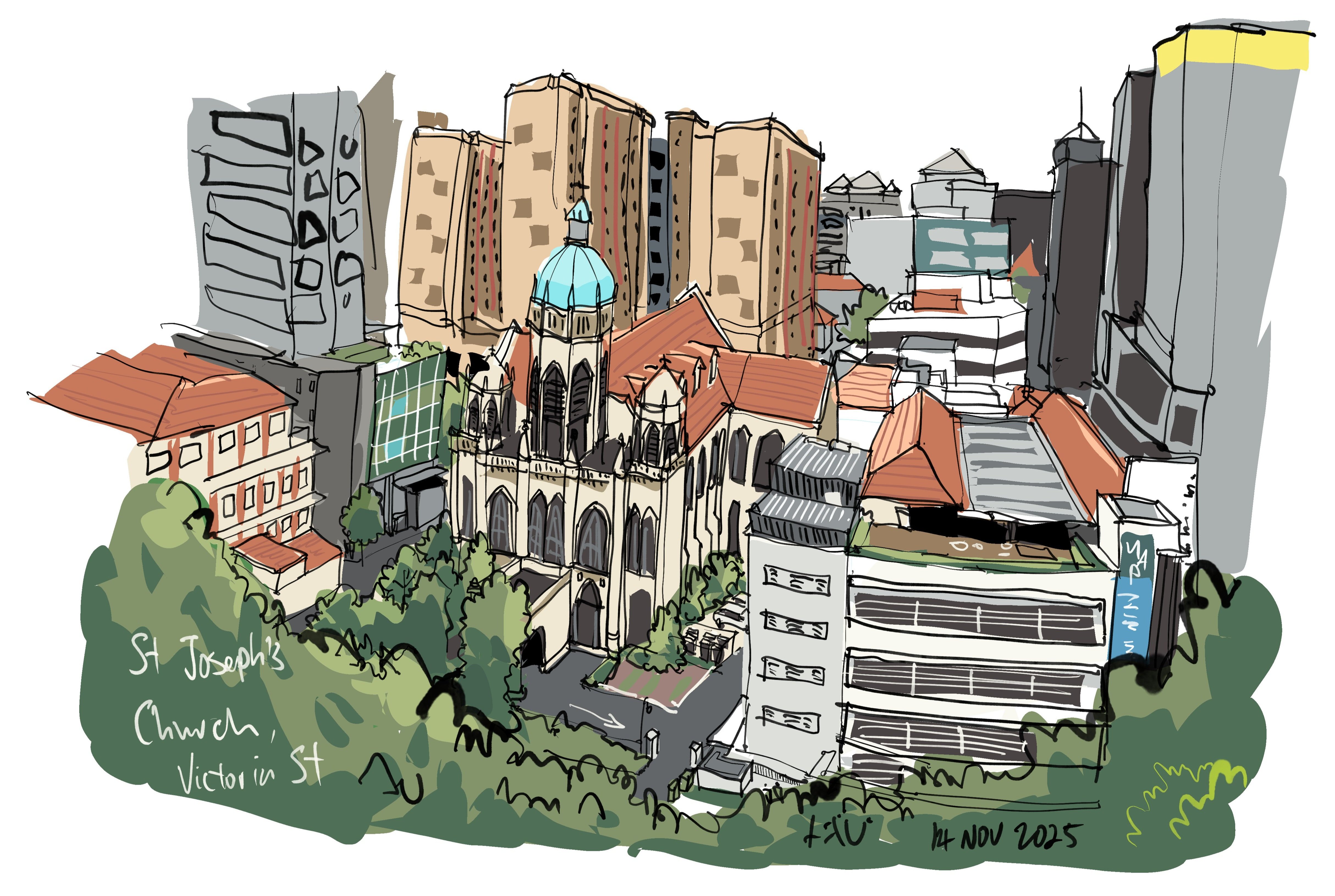 Teoh’s lovely sketch features the St Joseph's Church in Singapore, after renovations have been completed and the scaffolding removed.