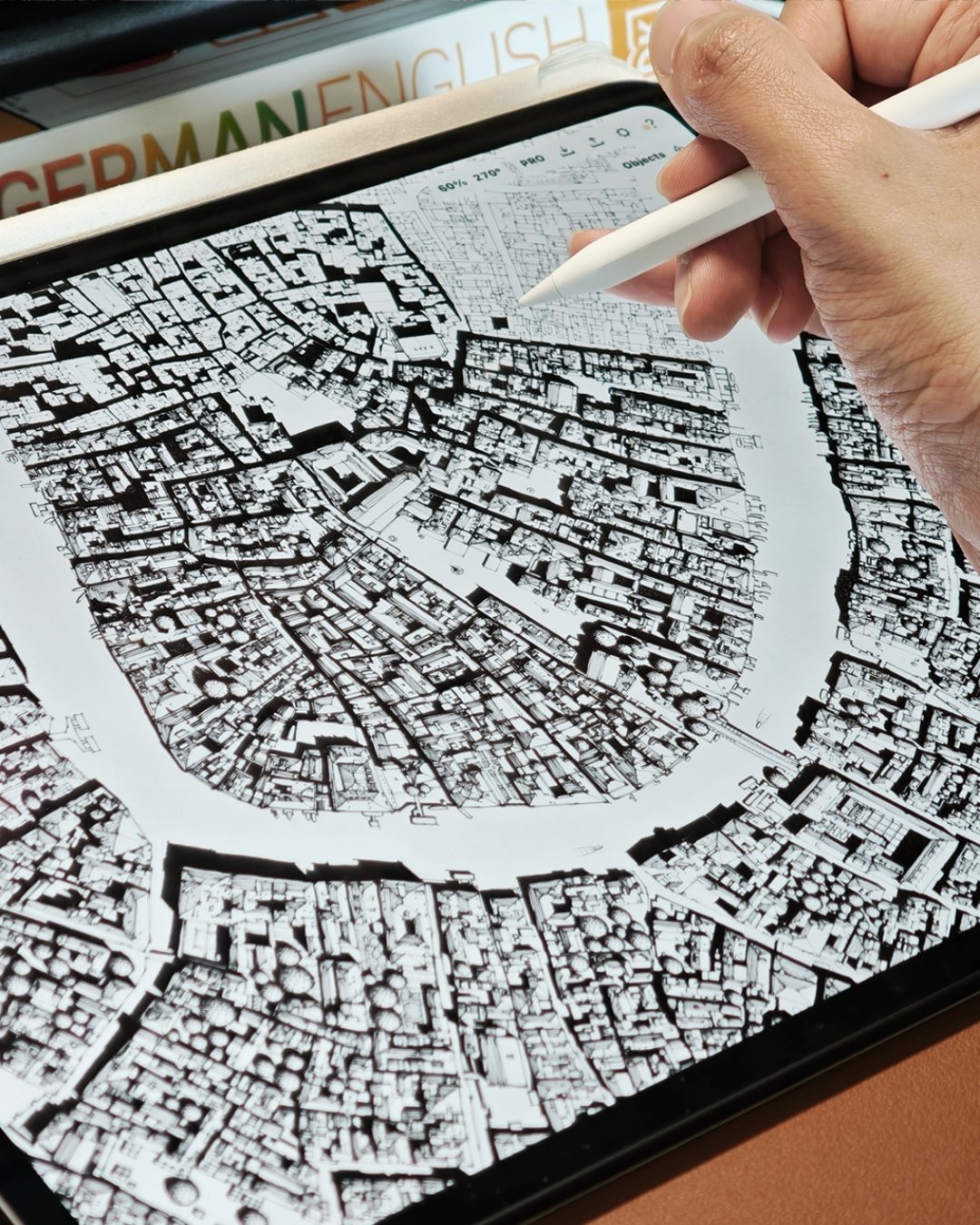 Stan's latest cityscape work of Venice, Italy. He uses delicate lines and shadows with enormous amounts of detail to render the unique textures of different cities.