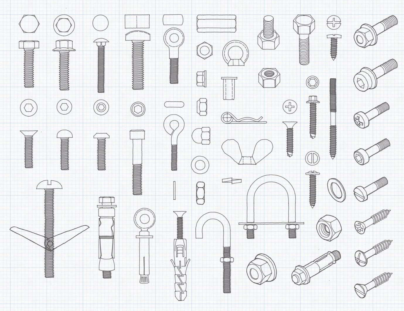The Nuts and Bolts Object Pack is a comprehensive library of 50 hand-drawn hardware components created for engineers, architects and designers who value technical accuracy and aesthetic clarity.