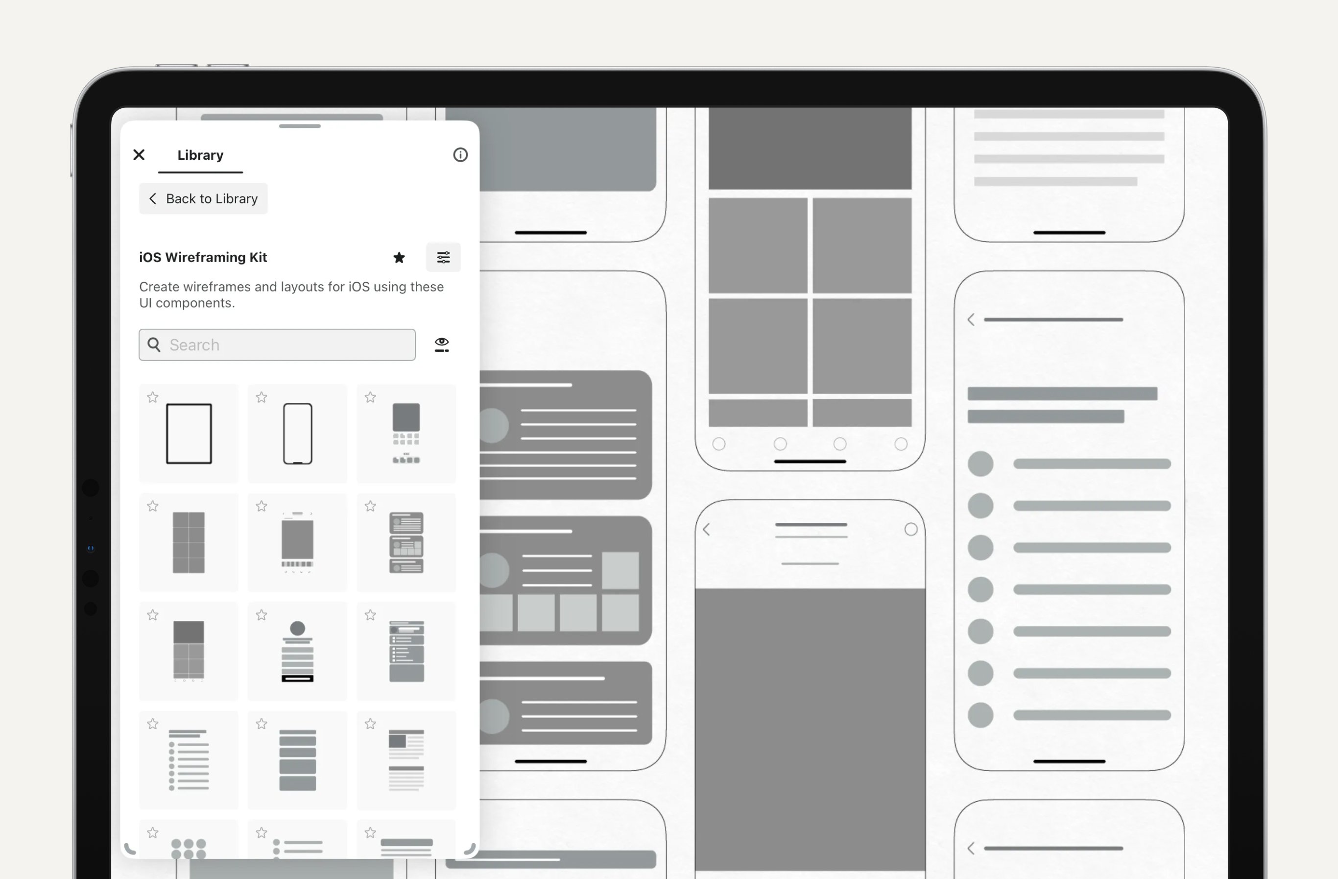 The iOS Wireframing Kit is available with a monthly/yearly subscription, or as a one-time purchase in Concepts. Find it by tapping Objects > iOS Wireframing Kit and start creating!