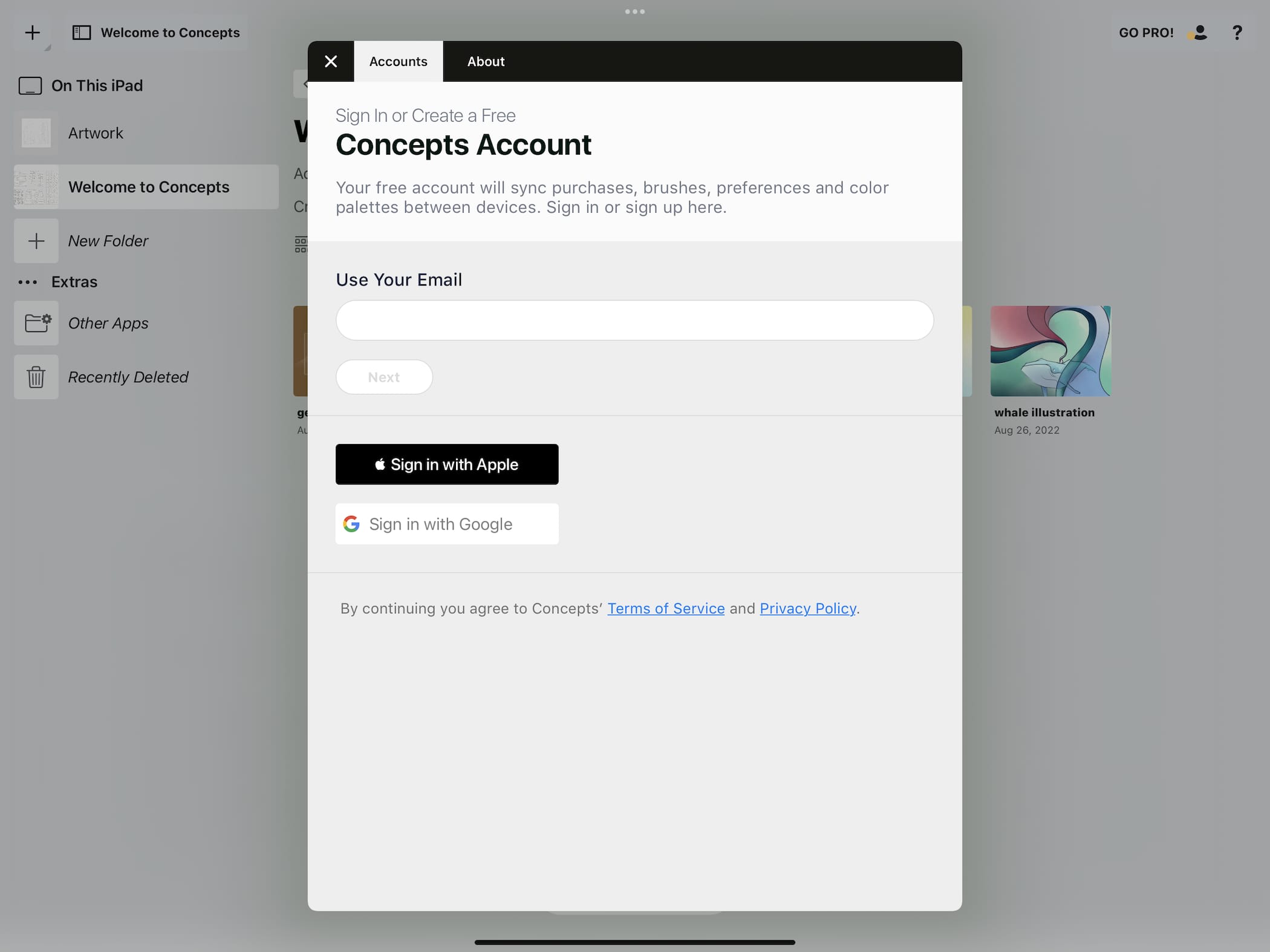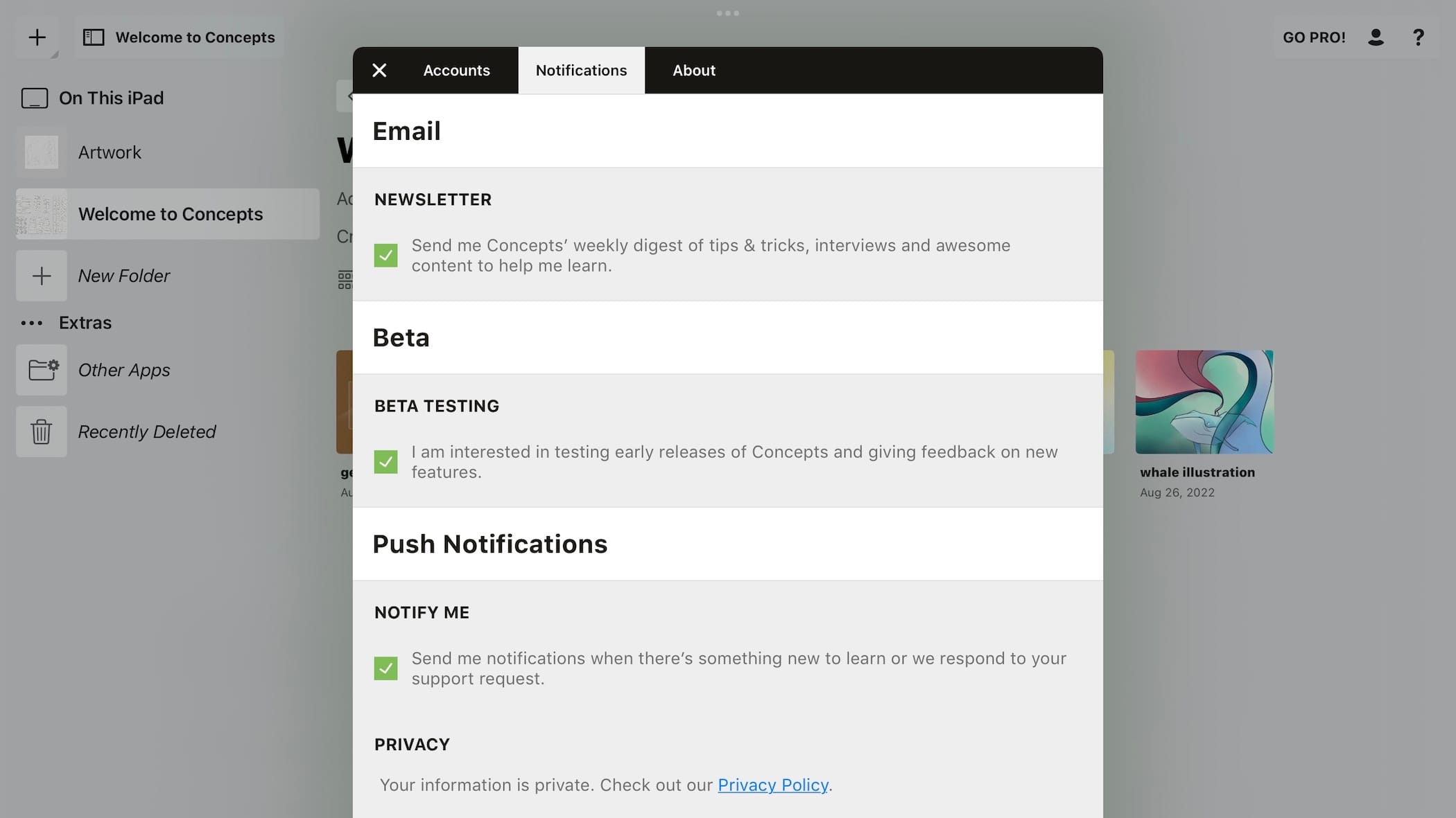 Concepts also has a dedicated "Concepts" folder in the Files app, under the location “On This iPad/iPhone”. This is where all of your work is stored, and the Gallery inside the Concepts app directly reflects the contents of this folder. Feel free to reorganize your work in either the Files app or the Concepts Gallery as you prefer. Any updates you make to drawings or folder details in Concepts will also update them in Files, and vice versa.