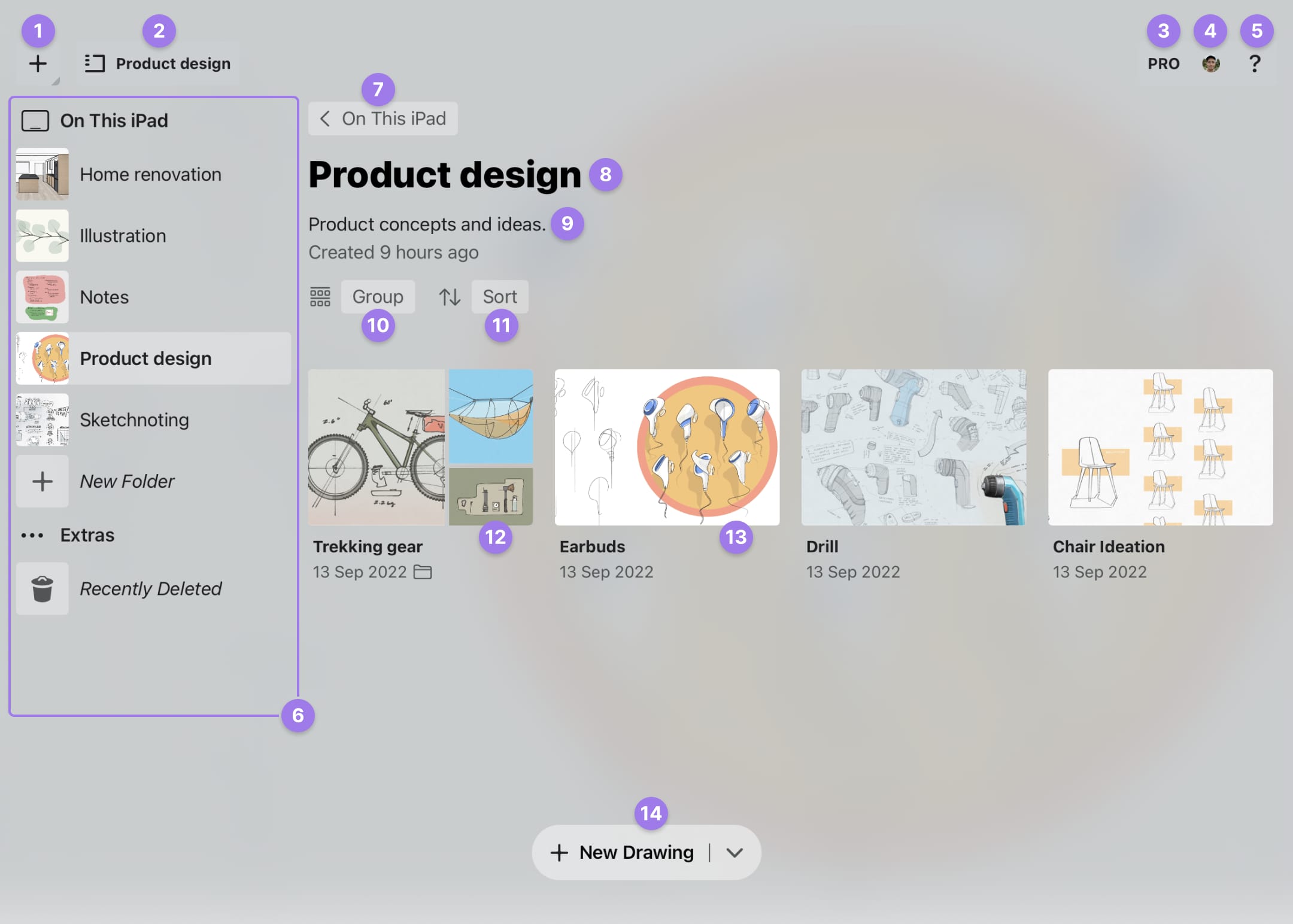 The first time you open Concepts, you’ll start in the Gallery. This is where all of your drawings are stored. They’re organized into folders.