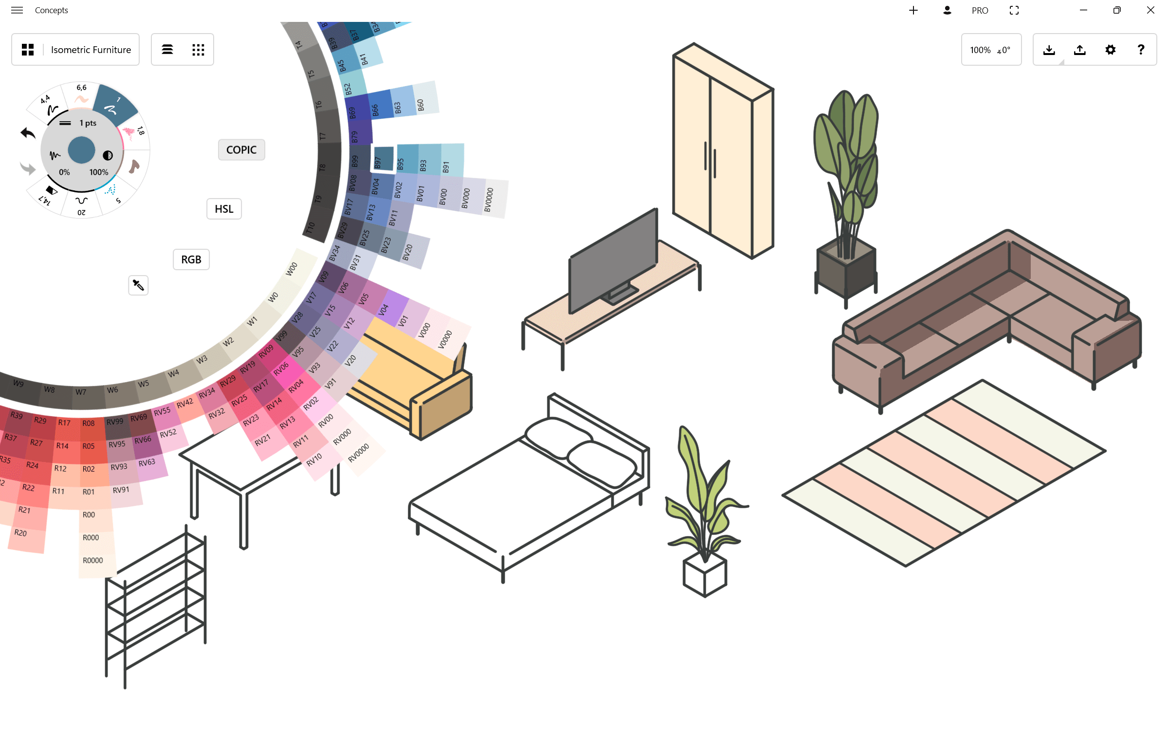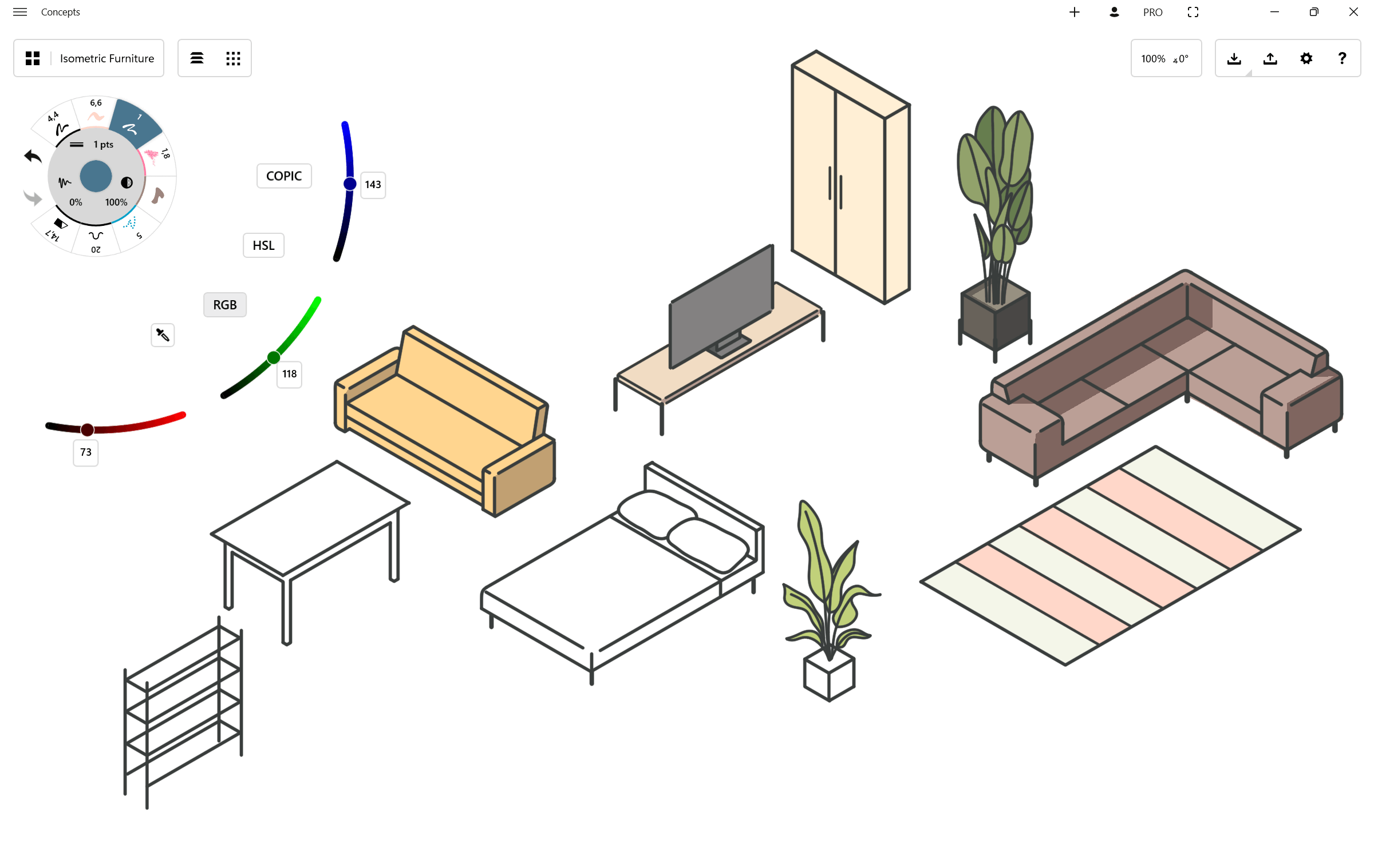 Tap the circle to bring up your current color wheel. Concepts has three color wheels to choose from: Copic, HSL, and RGB. Each of these uses its own approach to color selection.