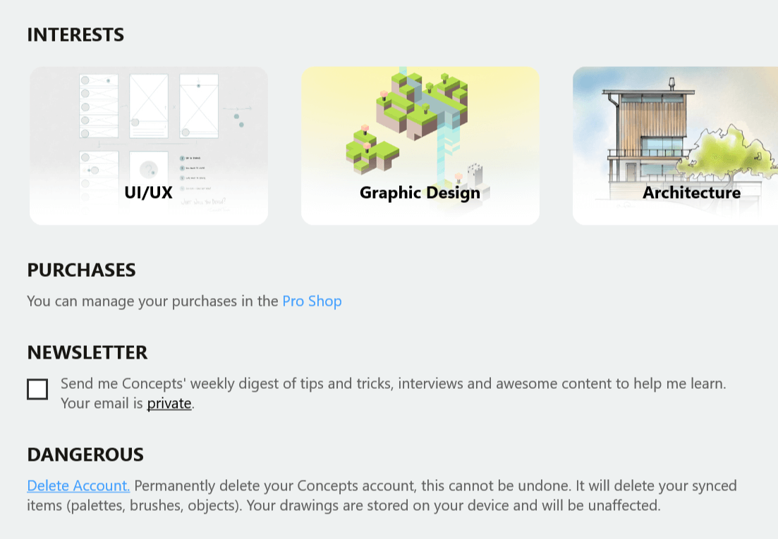 You can create a free Concepts Account to securely sync your subscription purchases between your devices. (Note that drawing sync is not available at this time.)