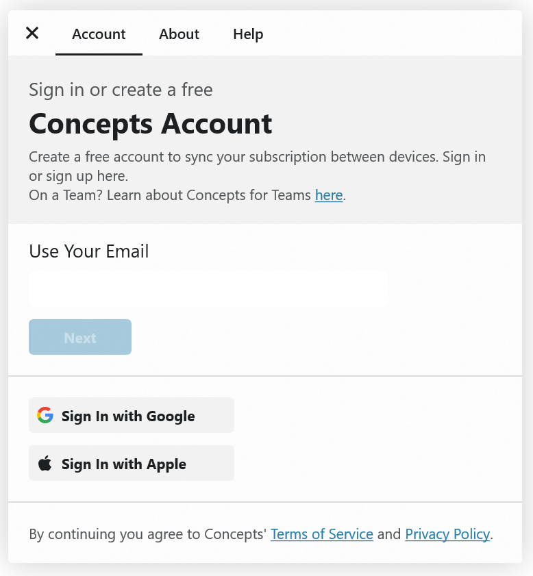 - Under the Accounts tab, enter your email address and create a password. We won’t share your email, it’s our way of contacting yours truly in the Concepts universe.
