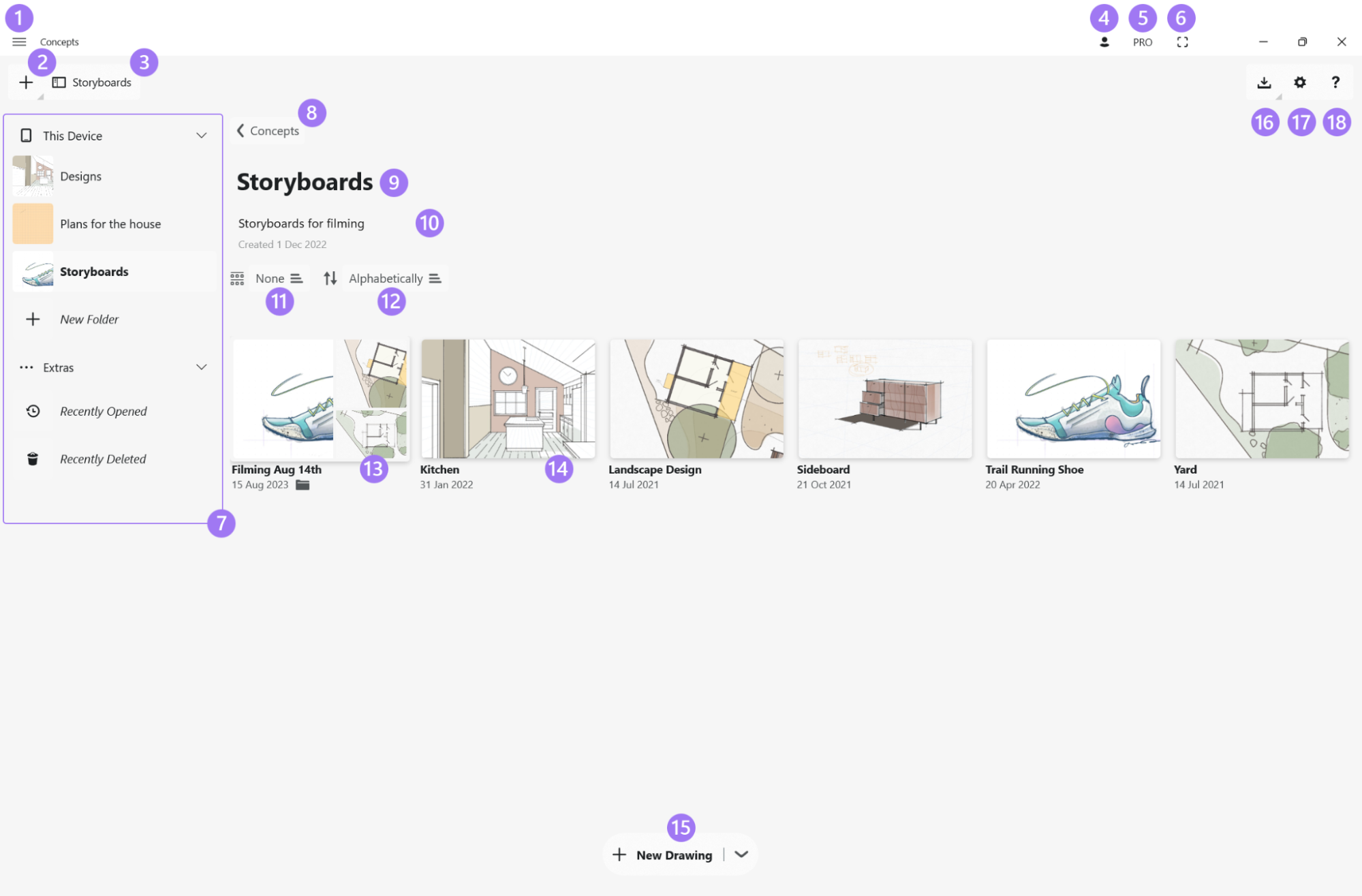 The first time you open Concepts, after the short onboarding, you’ll start in the Gallery. This is where all of your drawings are stored. They’re organized into folders