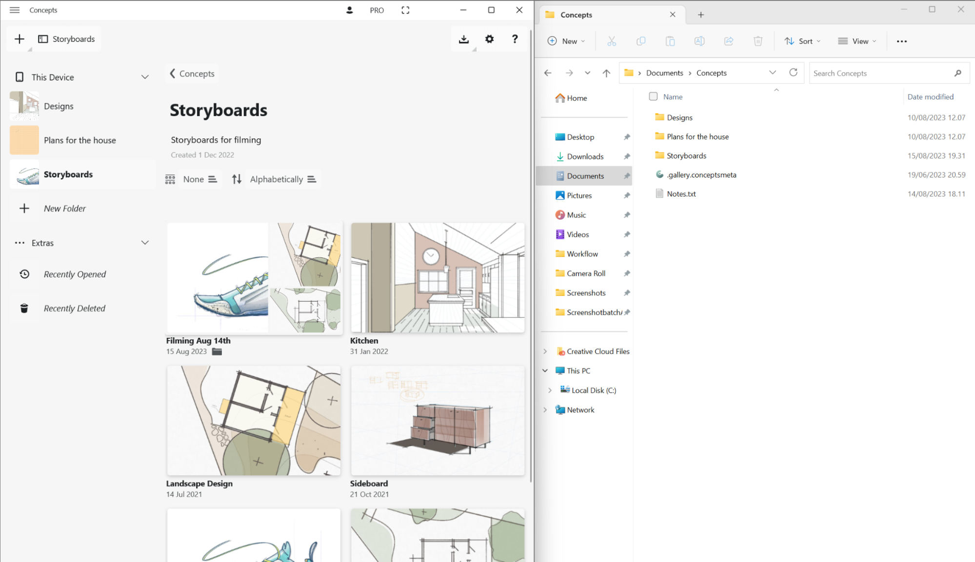 Concepts also has a dedicated "Concepts" folder in the File Explorer, under the location “This Device”. This is where all of your work is stored, and the Gallery inside the Concepts app directly reflects the contents of this folder. Feel free to reorganize your work in either the File Explorer or the Concepts Gallery as you prefer. Any updates you make to drawings or folder details in Concepts will also update them in File Explorer, and vice versa.