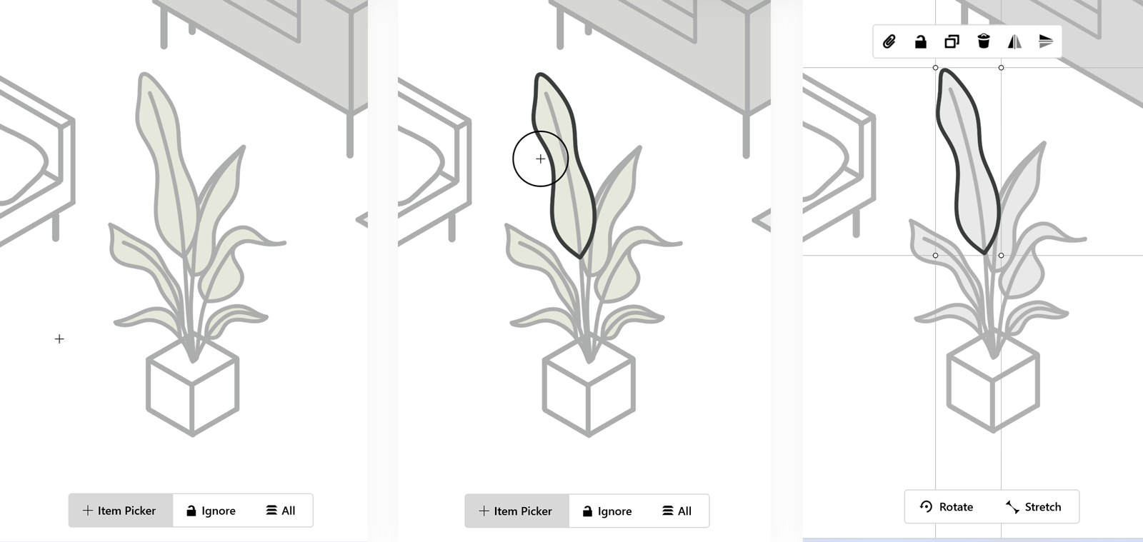 On the left-hand of the selection toggle is your Item Picker. This is a single item selection mechanism, which allows you to add and subtract individual strokes to your selection.