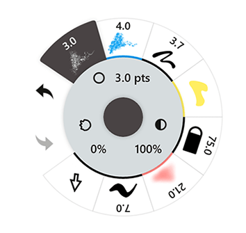 Tap a tool on the outer ring to activate it and start drawing. Tap it again (or double-tap an inactive tool) to enter the Brushes menu, where you can choose from many different tools and find your flair. More about this in Brushes.
