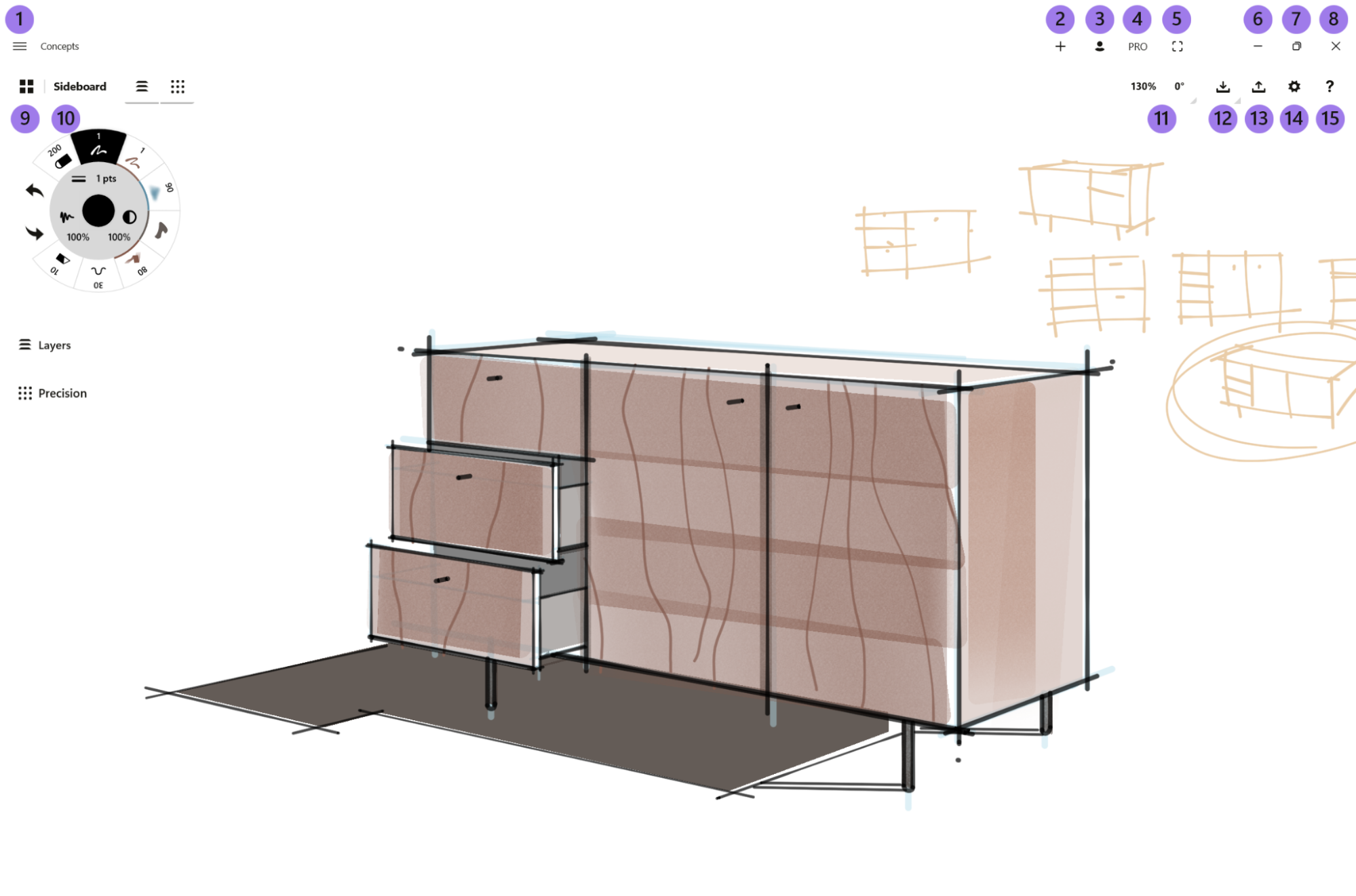 - Drawing Name. You’re working on the “Sideboard” drawing. You can rename the drawing by clicking on the name.