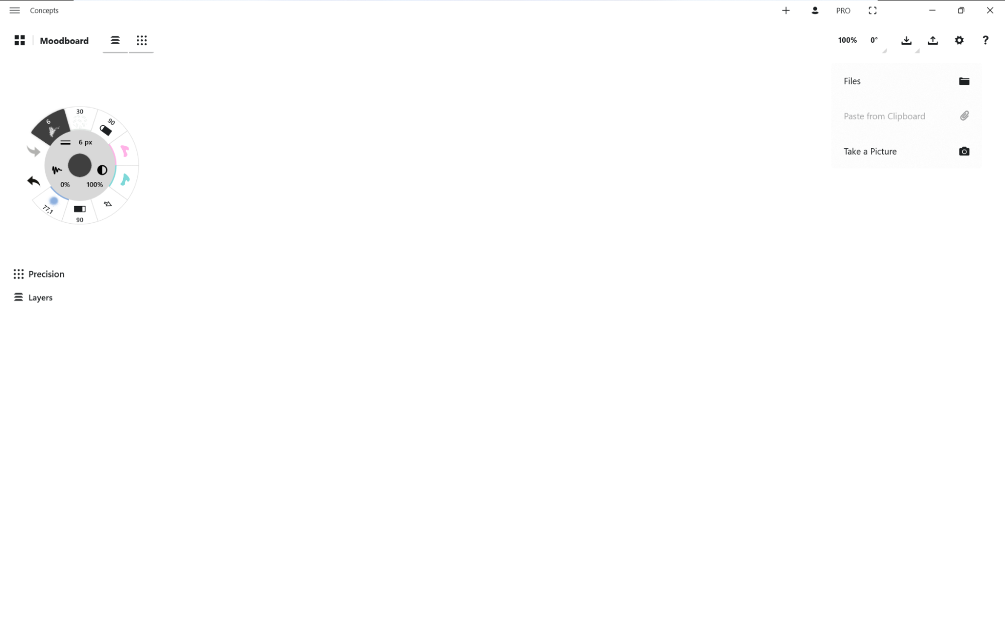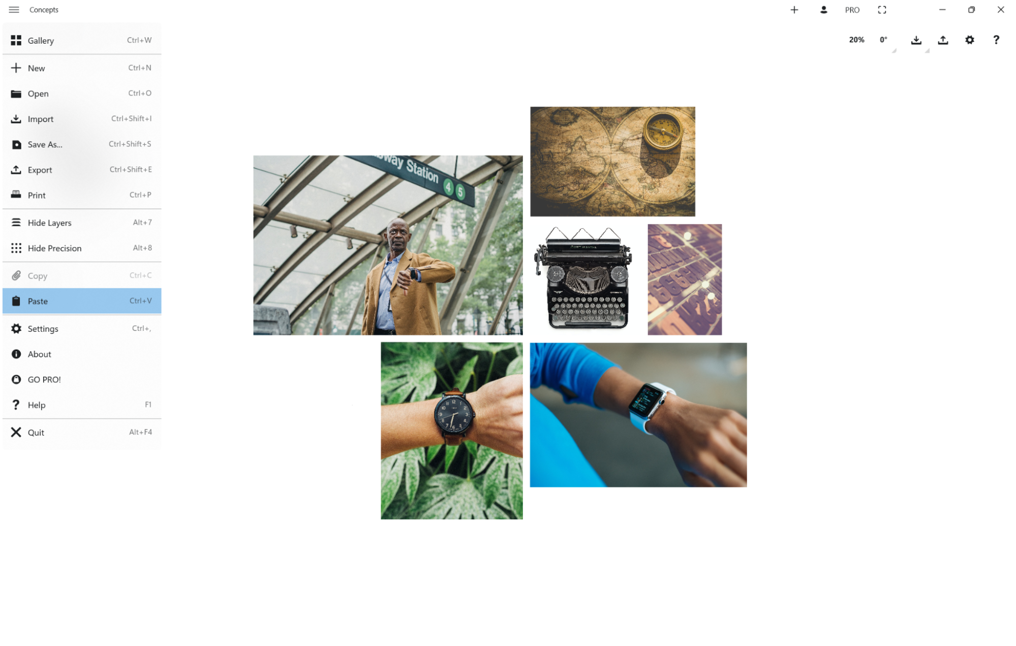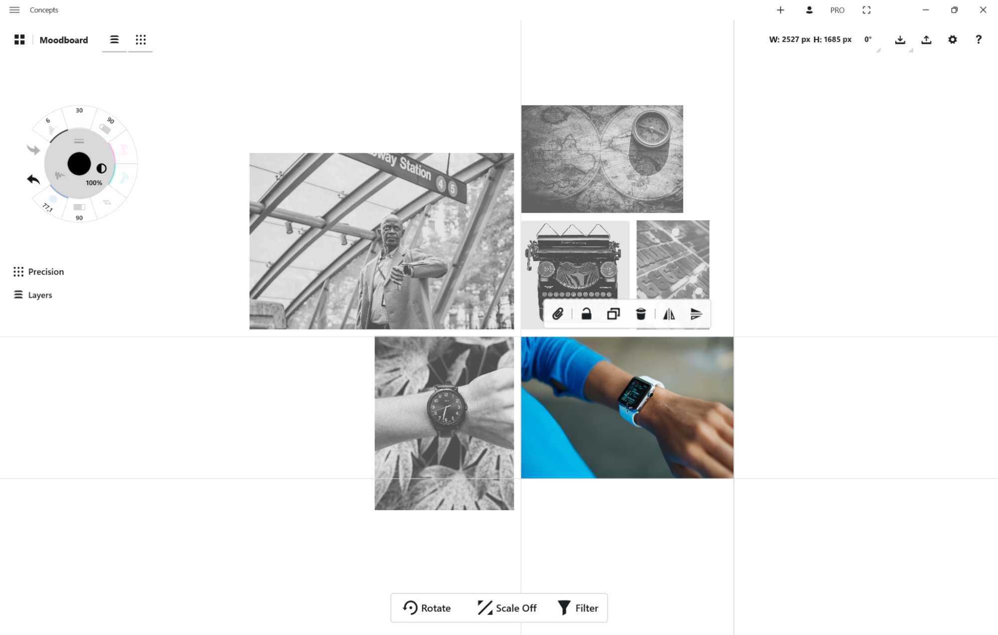 画像は1つでも複数でも、一度にまとめてキャンバスに取り込むことができます。またコンセプトのすべてのエレメントと同じように、それぞれの画像は、選択、キャンバス上やレイヤー間の移動、不透明度・サイズ・回転の調整、描画、マスキング、複製が可能です。