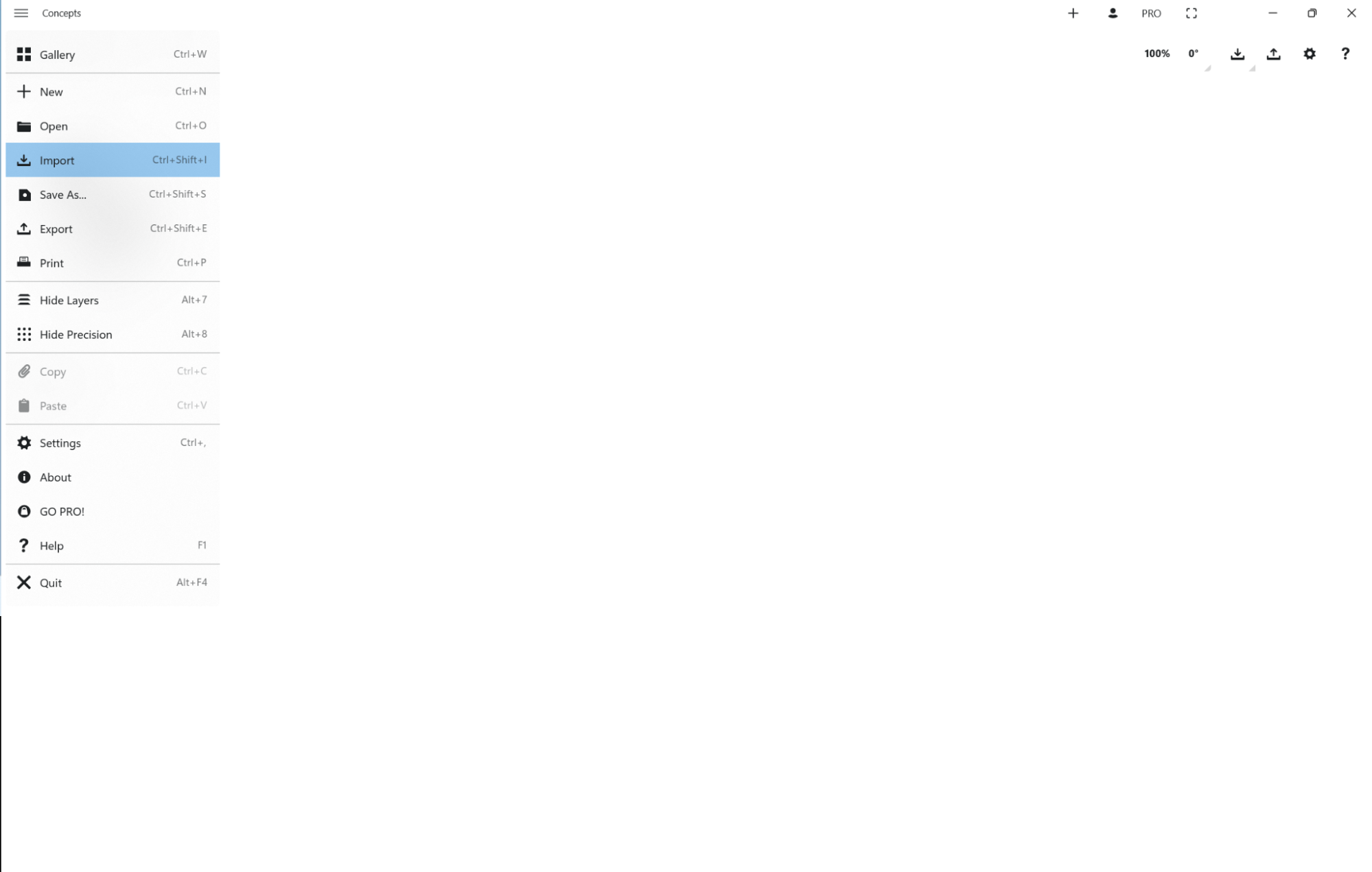 - 画像 (JPG または PNG) や、描いた絵から選択したものをコンセプトのデッサンへ読み込むには、ステータスバーの左上にあるメニューを開き、「インポート」をタップします。